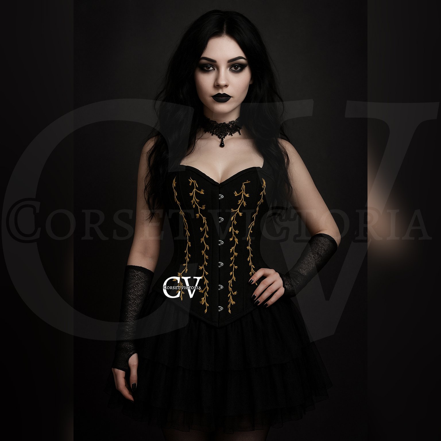 Corset Victoria Black Satin With Golden Embroidery Work Overbust Corset Gothic Halloween Costumes