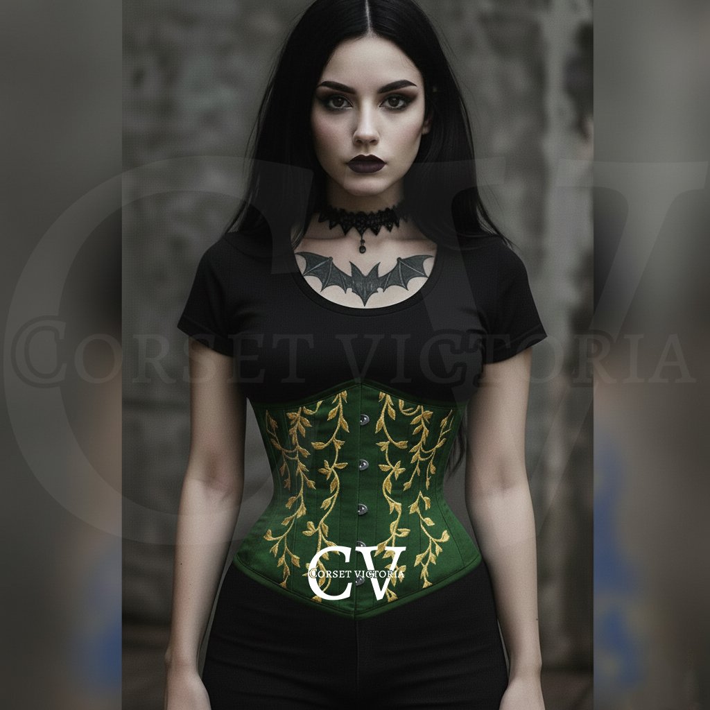 Gothic Design: Striking Green corset with black vine embroidery for a spooky yet elegant look.