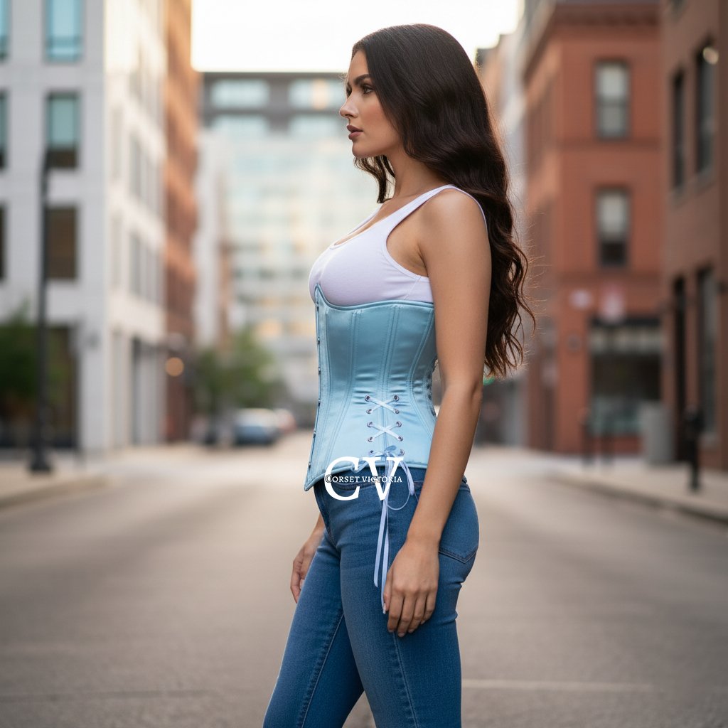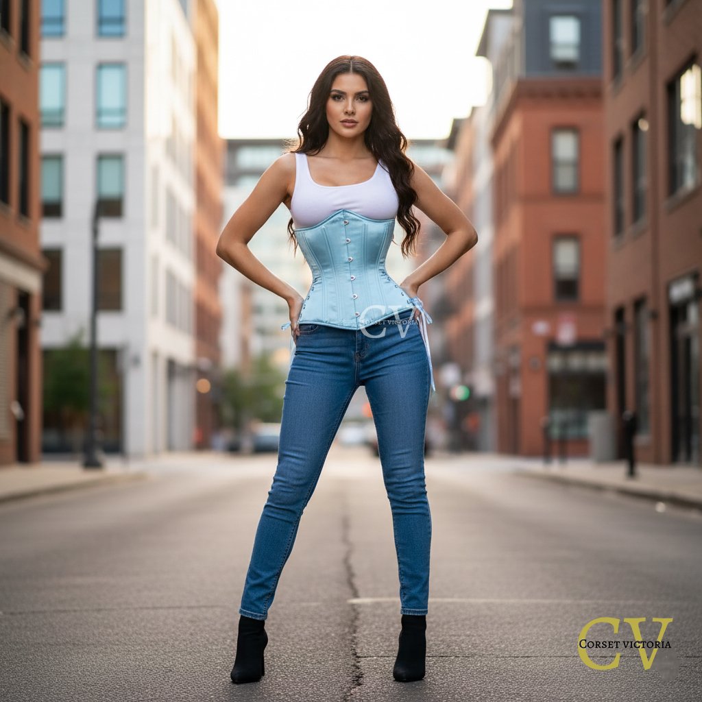 Turn heads this Halloween with a versatile Light blue underbust corset. designed to accentuate your natural curves with a structured hourglass fit. Featuring a steel busk front closure, supportive boning, and satin ribbon lacing at the back and side, this corset combines timeless elegance with modern urban fashion. Pair it effortlessly with jeans, skirts, or layered outfits for a chic day-to-night Halloween burlesque look.