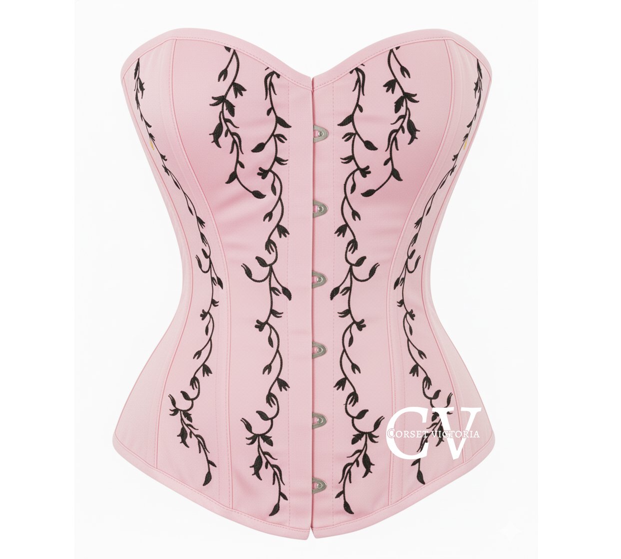 Corset Victoria Pink Satin With Black Embroidery Work Overbust Corset Gothic Halloween Costumes