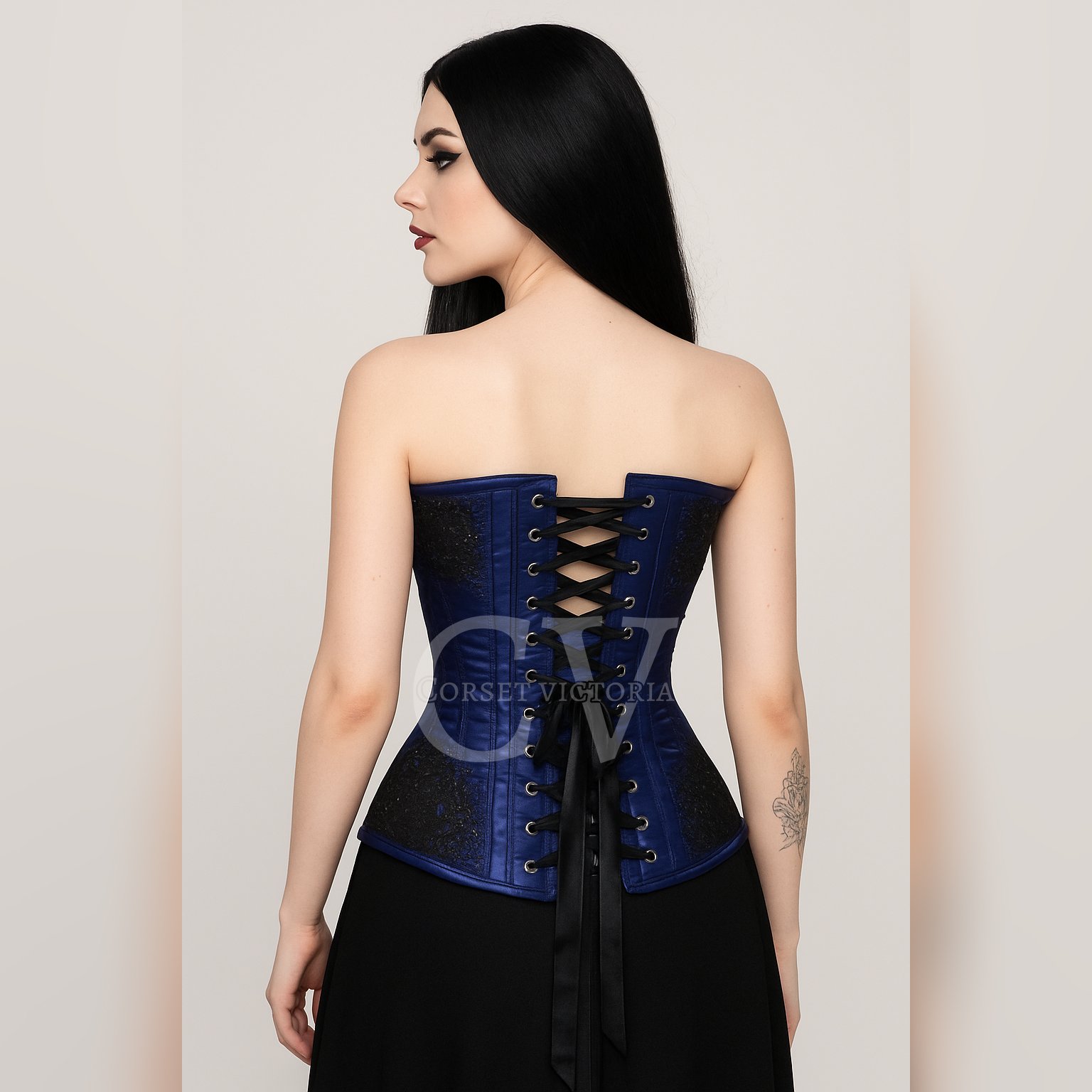 Gothic corset, Royal blue satin fabric with black lace overlay